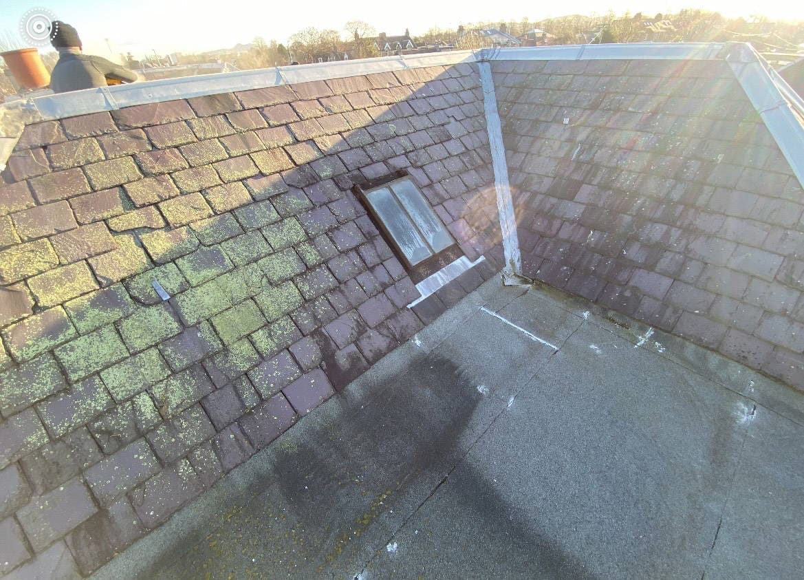 Strip and re slate from worn out Welsh to new Spanish slates along with a flat roof replacement