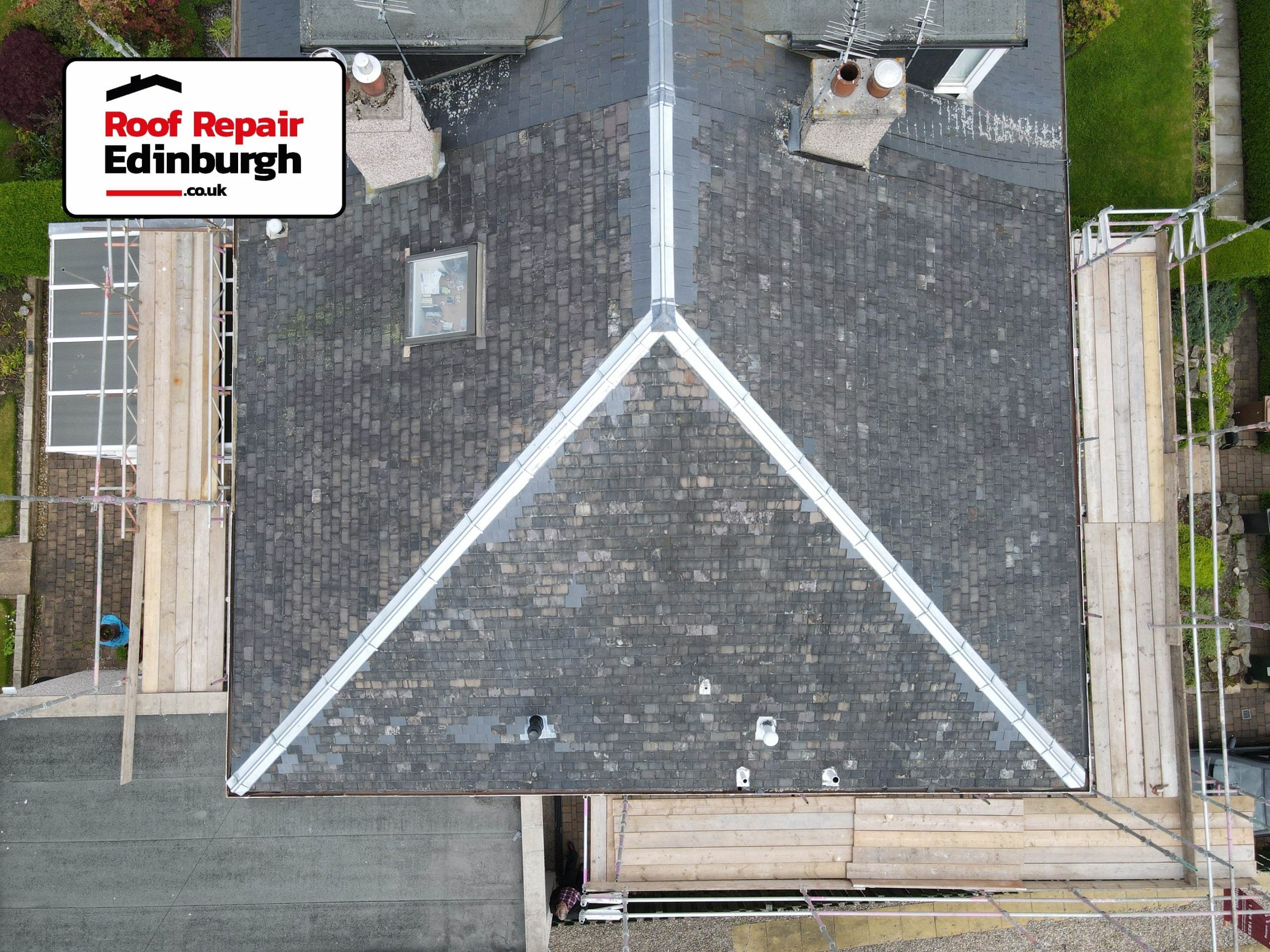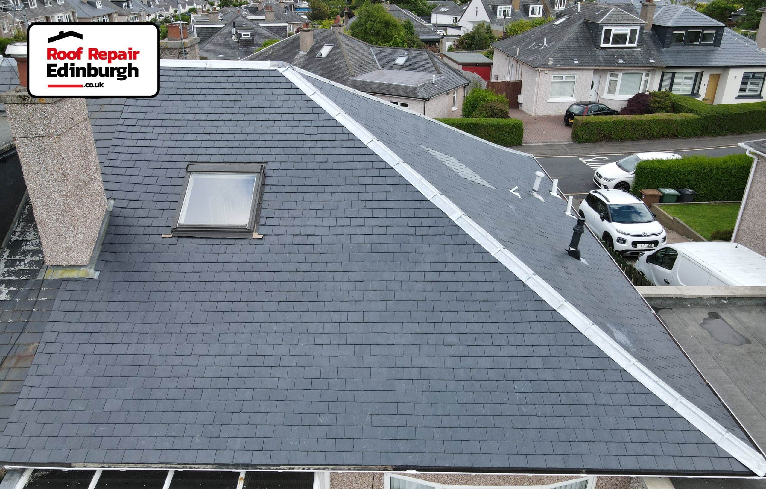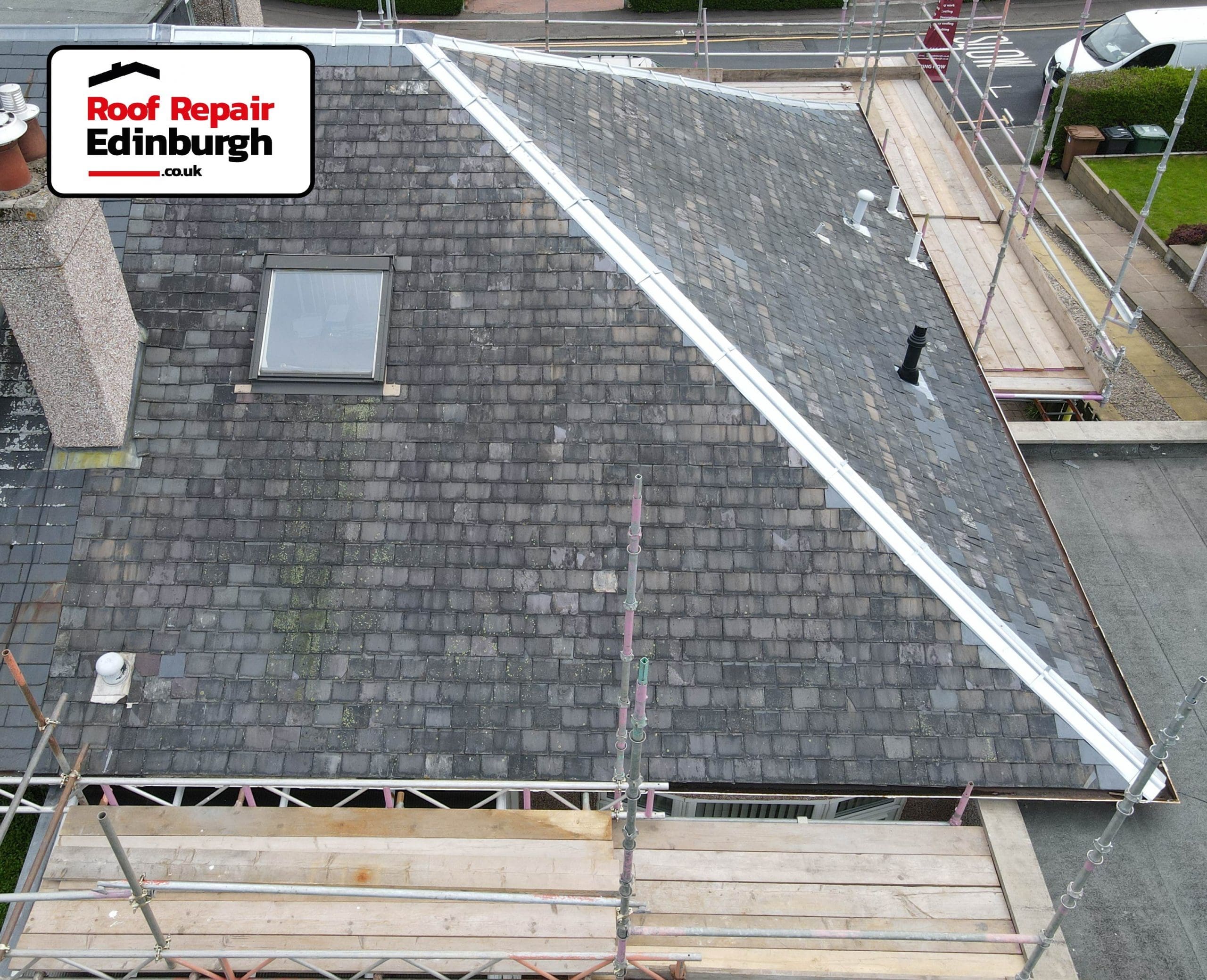 We were tasked with the strip & re-slate of a complete house roof in Newington, Edinburgh, which also included relaying a new 3 layered felting system on the flat roof and coating the gabel end chimney in K-rend. The roof was reslated using Brazillian Green slate.